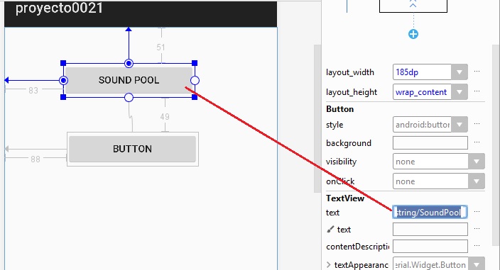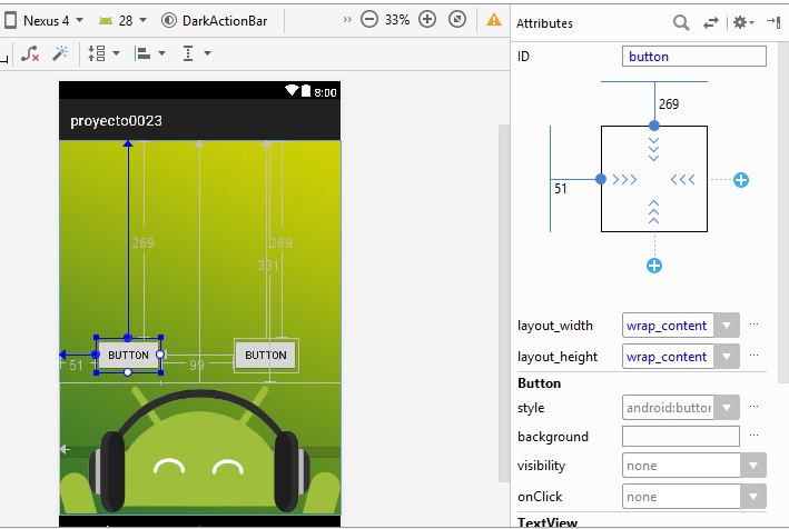 ajustamos el botón, lo subimos un poco, y borramos el TextView en