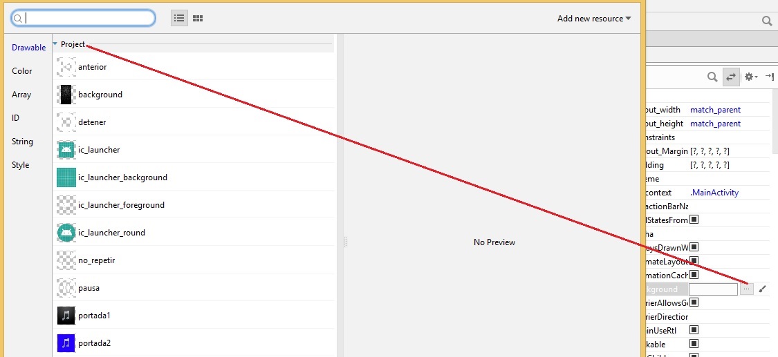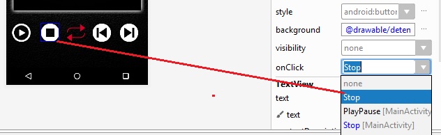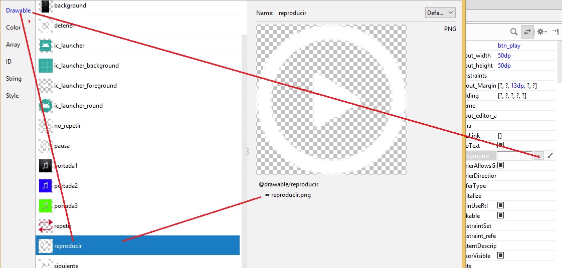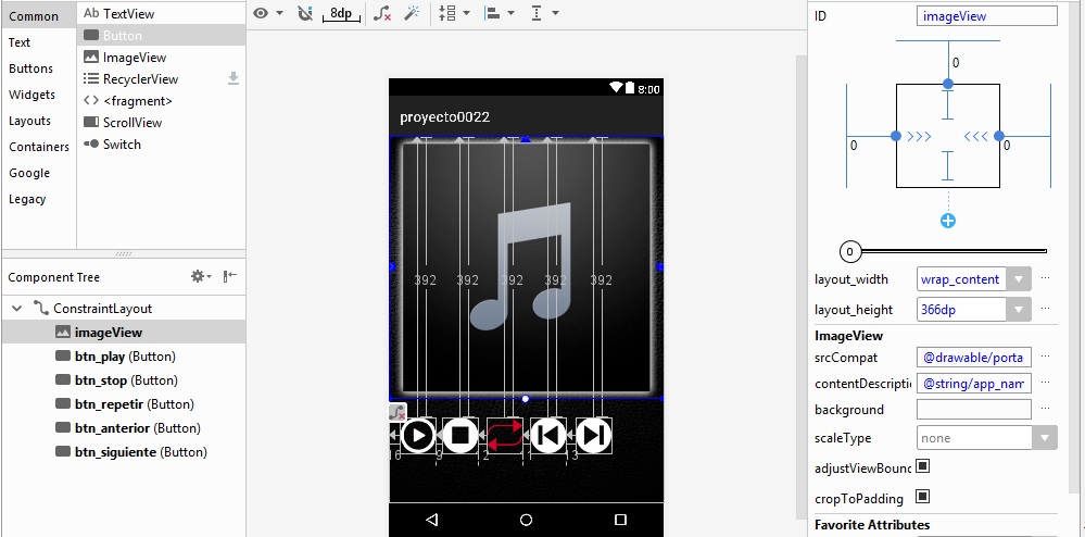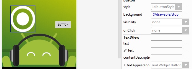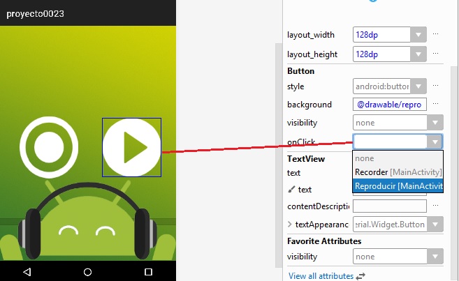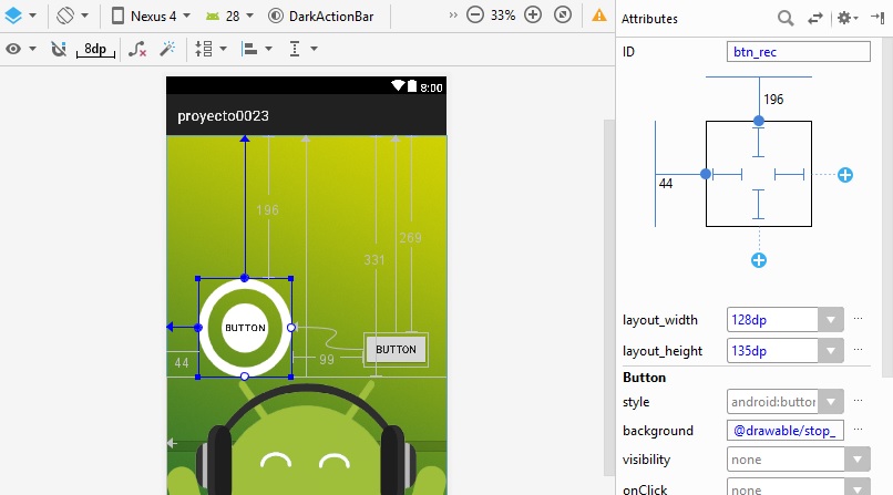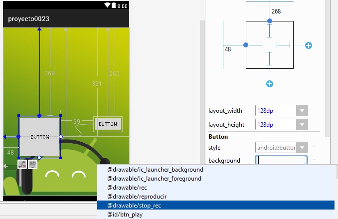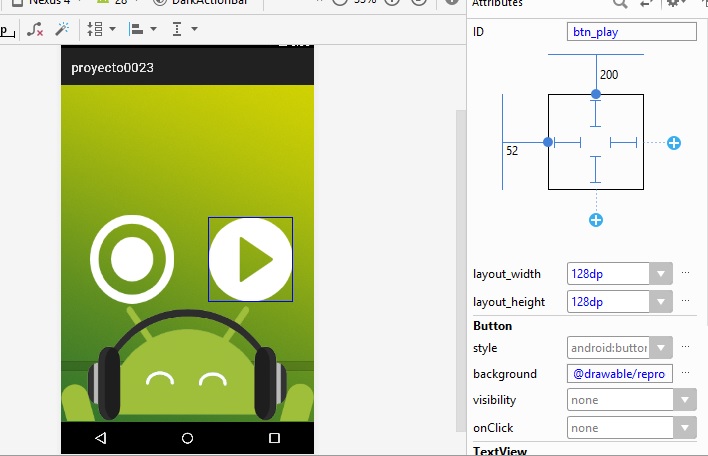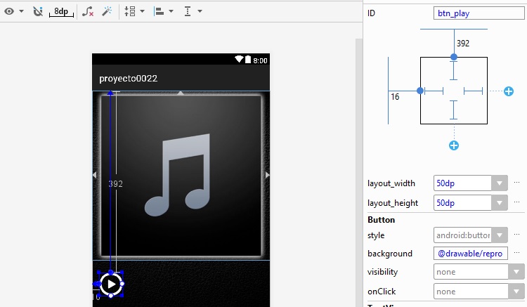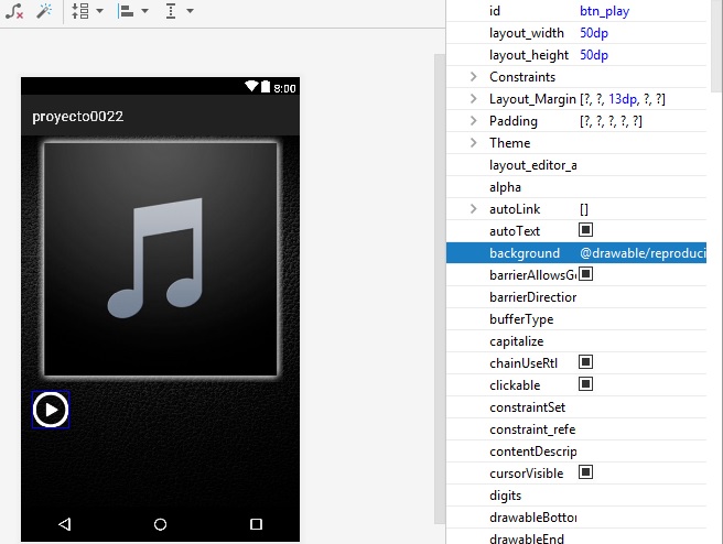 layout_height a 128dp, y al botón btn_play, se agrega la imagen en