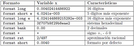 Los resultados numéricos que ofrece MatLab se pueden visualizar en diferentes formatos. Por defecto, si un resultado es un número entero, lo ofrecerá como tal. Si no lo es, lo haría con 4 cifras decimales (redondeando a la cuarta cifra). Si el resultado es un número grande, lo expresara en notación científica. Este formato que usa por defecto se puede modificar en el menú File Preferences Numeric Format, aunque también se puede hacer directamente escribiendo las órdenes a continuación