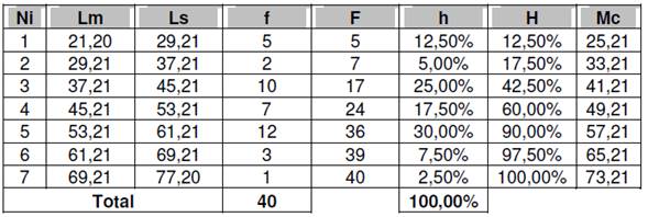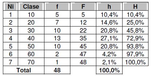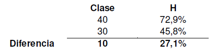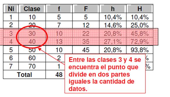 La diferencia entre las frecuencias relativas nos indica que existe entre las clases 27,1% de los datos. Para llegar al 50% de los datos, debemos incrementar en 4,2% datos partiendo desde la clase 30.