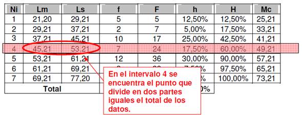 Podemos observar que el punto que divide el 50% de los datos esta entre el intervalo de clase 3 y 5, para ser más preciso, entre los valores 45,21 y 53,21 (hasta 45,21 hay agrupados el 42,50% de los datos, y hasta 53,21 se resume el 60,00% de los datos).
