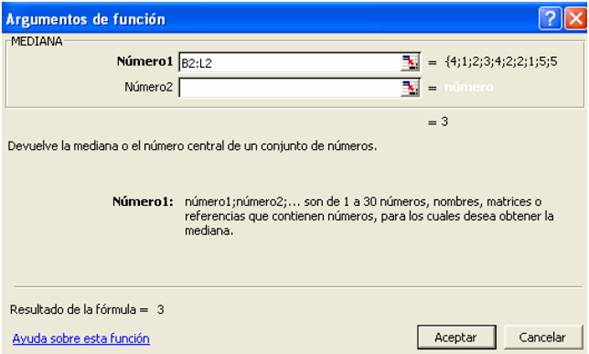 Active la función MEDIANA en la celda B4 y en el campo número1 seleccione los datos del ejercicio.