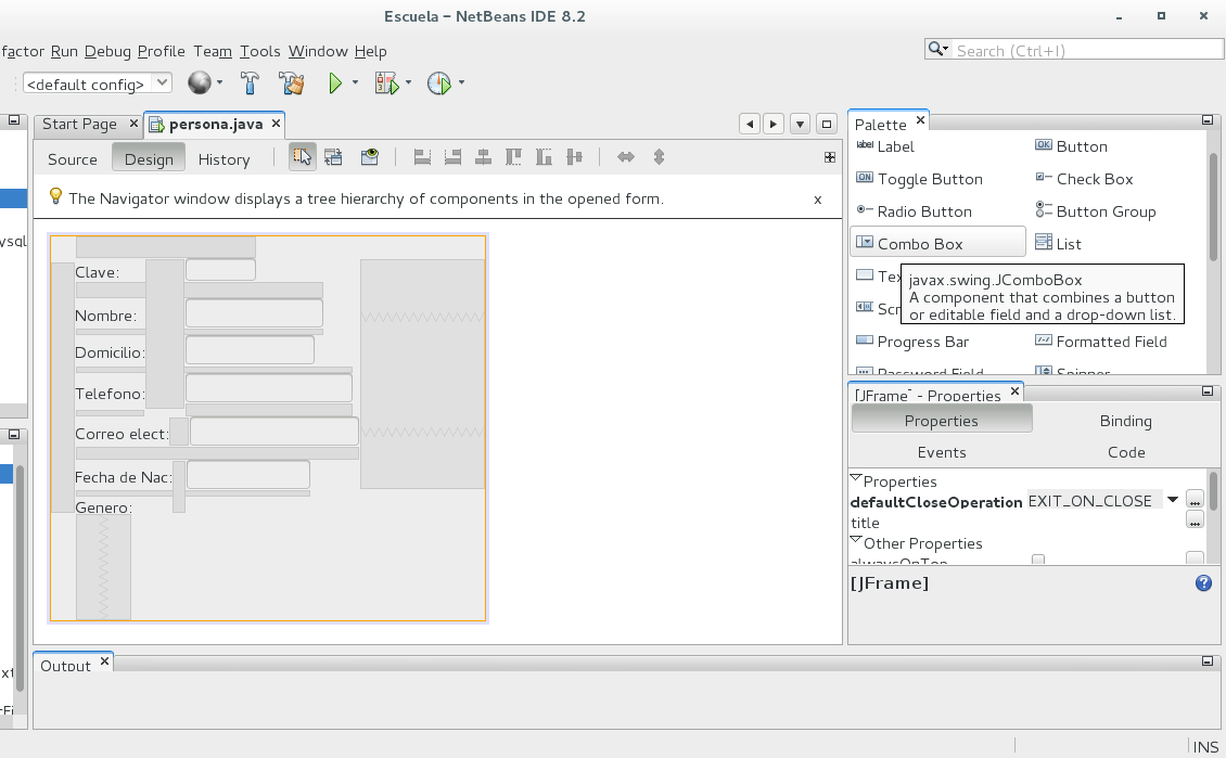Proseguimos con NetBeans para crear con un frame el ejemplo con un botón para la consulta de la base de datos.