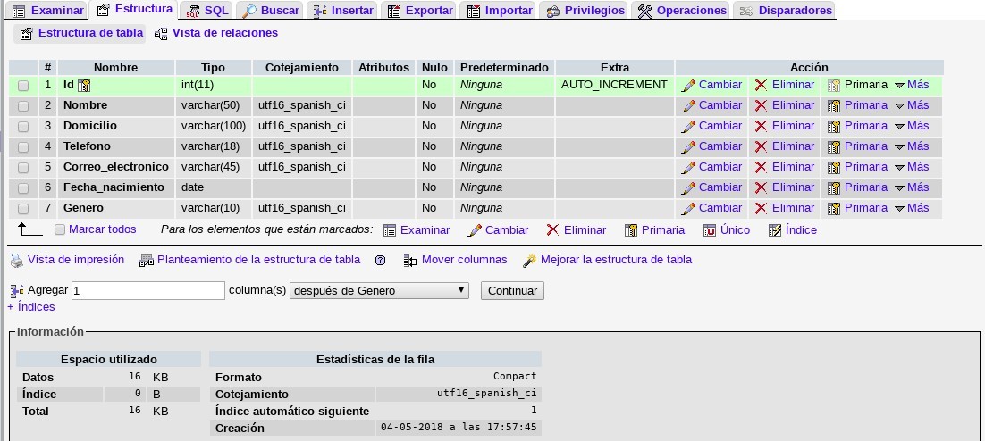 tabla, y un cuadro de texto para observar el Id, este es automatico y